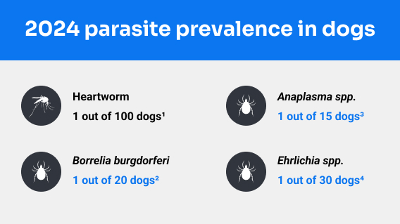 Screen for heartworm and six tick-borne pathogens in a single sample, including Ehrlichia canis, Ehrlichia ewingii, Ehrlichia chaffeensis, Anaplasma phagocytophilum, Anaplasma platys, and Borrelia burgdorferi (Lyme infection).